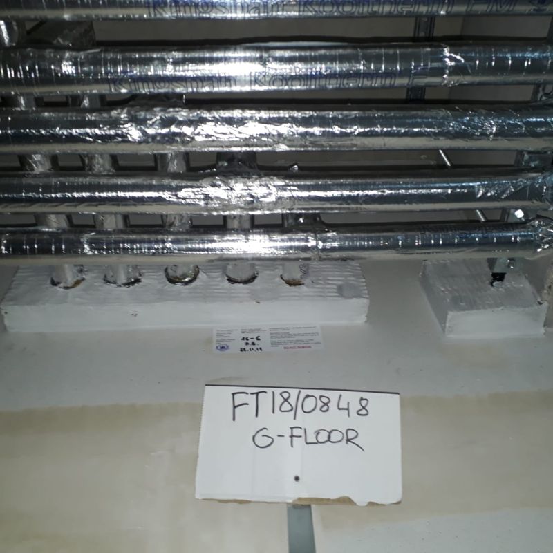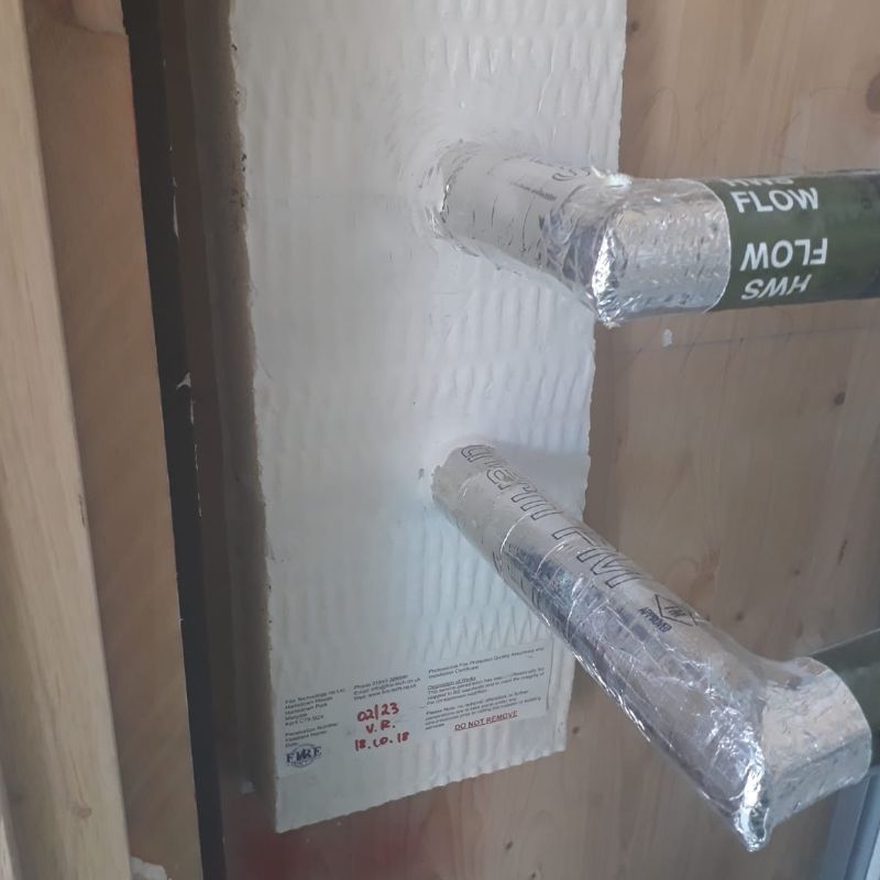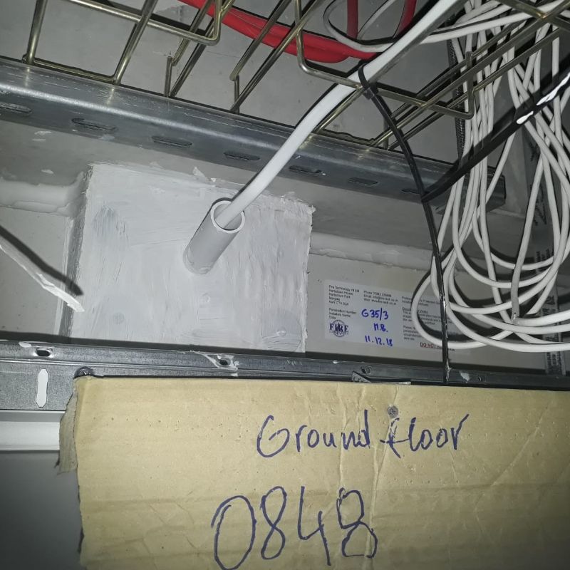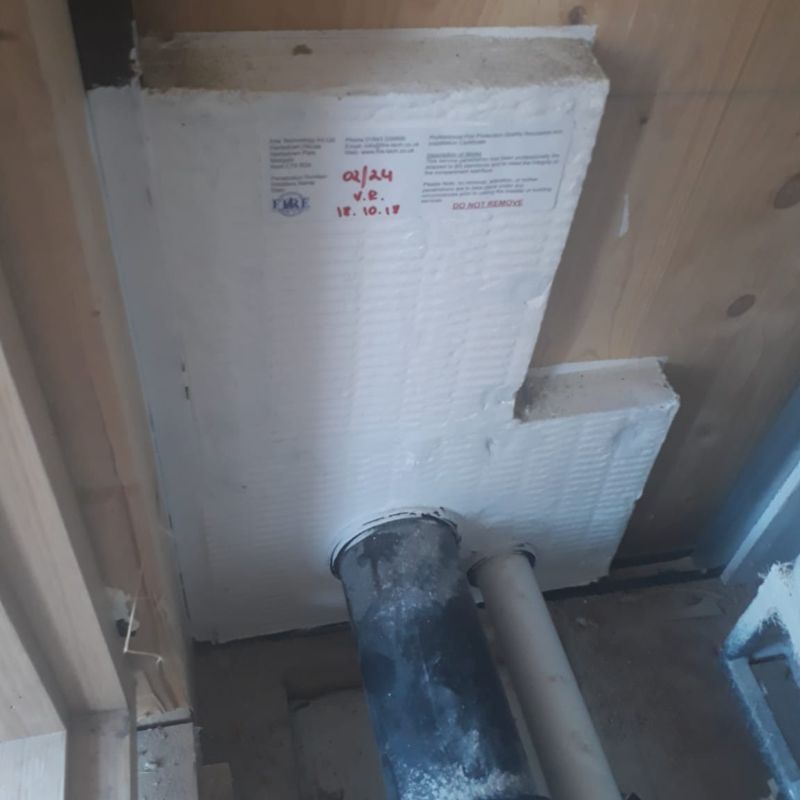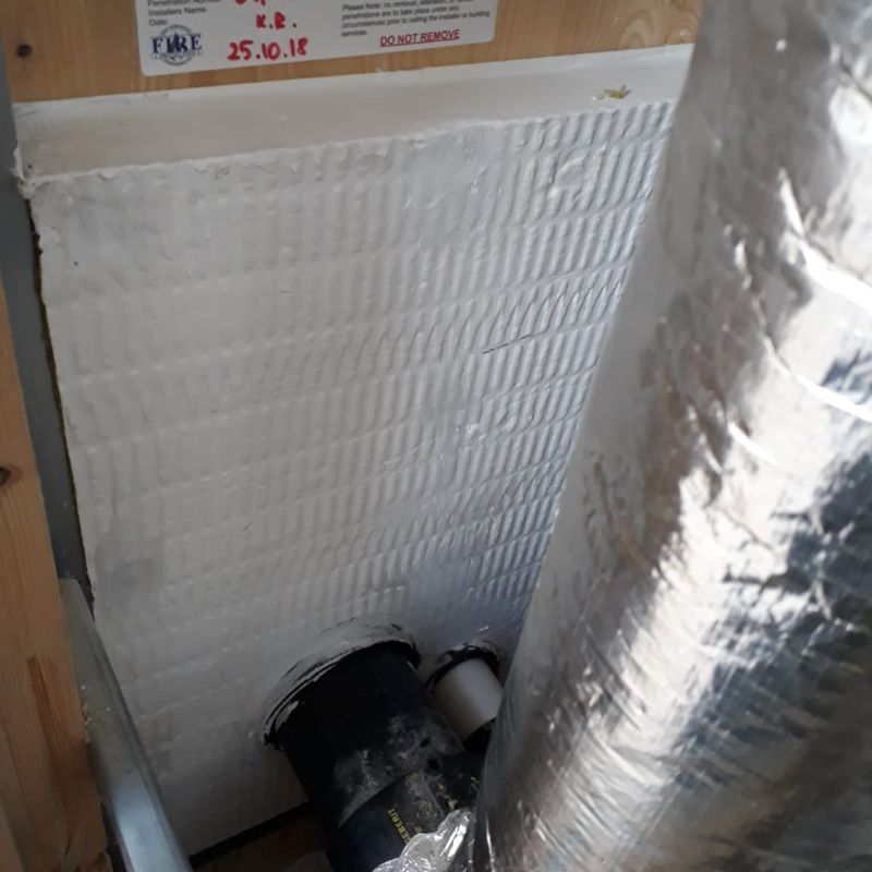 Fire stop open risers/ service penetrations through compartment slabs/floors by using both non load and load bearing fire stops - This is achieved by carefully scribing, cutting and friction fitting thick high density coated fire batt in and around multiple services within riser - sealing all edges, joints and abutments with intumescent mastics and sealants including wraps and collars if required.